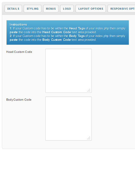For a number of reasons (eg. Google Analytics) you might need to add some code within the <head> or <body> tags of your template so we have added some fields to allow you to do so.